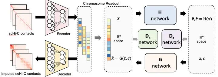 Deciphering 3D genome conformation is important for understanding gene regulation and cellular function at a spatial level. The recent advances of single cell Hi-C technologies have enabled the profiling of the 3D architecture of DNA within individual cell, which allows us to study the cell-to-cell variability of 3D chromatin organization. Computational approaches are in urgent need to comprehensively analyze the sparse and heterogeneous single cell Hi-C data. Here, we proposed scDEC-Hi-C, a new framework for single cell Hi-C analysis with deep generative neural networks. scDEC-Hi-C outperforms existing methods in terms of single cell Hi-C data clustering and imputation. Moreover, the generative power of scDEC-Hi-C could help unveil the differences of chromatin architecture across cell types. We expect that scDEC-Hi-C could shed light on deepening our understanding of the complex mechanism underlying the formation of chromatin contacts.